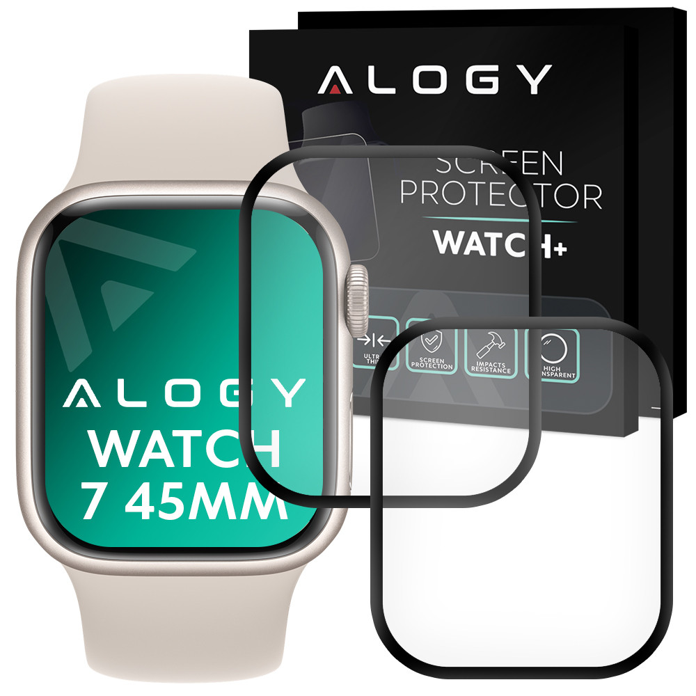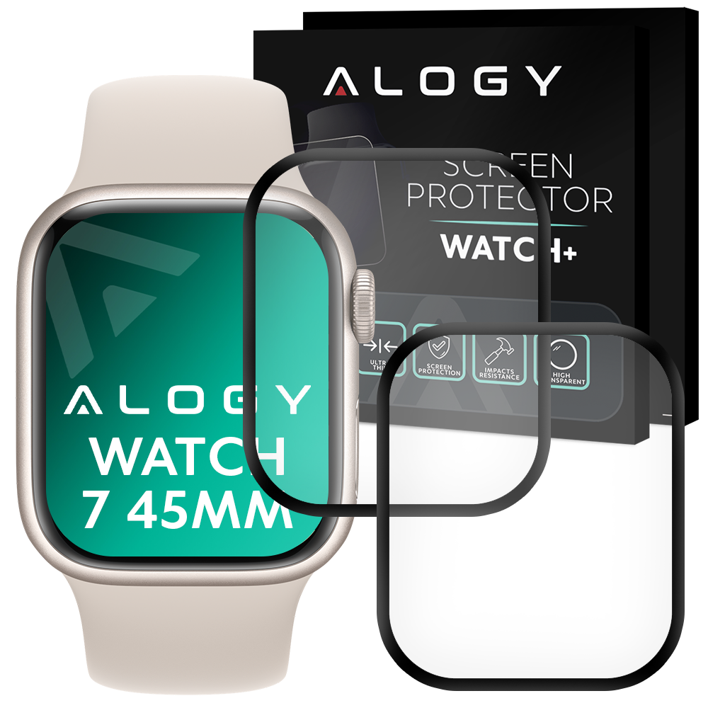 Szkło hybrydowe marki Alogy dedykowane do Apple Watch 7 45mm o elastycznej strukturze to produkt, który został idealnie dopasowany do całej powierzchni ekranu wraz z jego zaokrąglonymi brzegami, a dzięki czarnej ramce stapia się z urządzeniem i tworzy z nim całość.