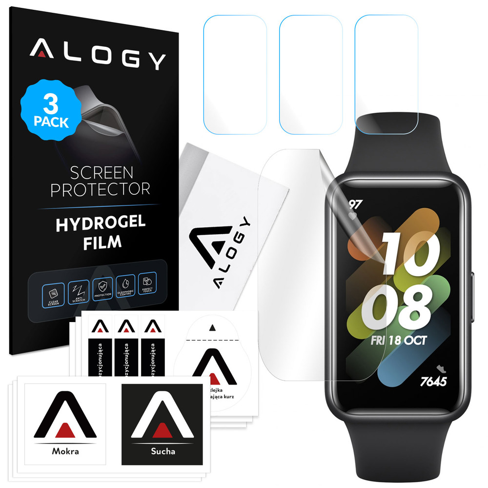- W zestawie: 3x Folia hydrożelowa Alogy, 3x mokra ściereczka, 3x sucha ściereczka, 3x Zestaw naklejek odpylających, 1x Rakla