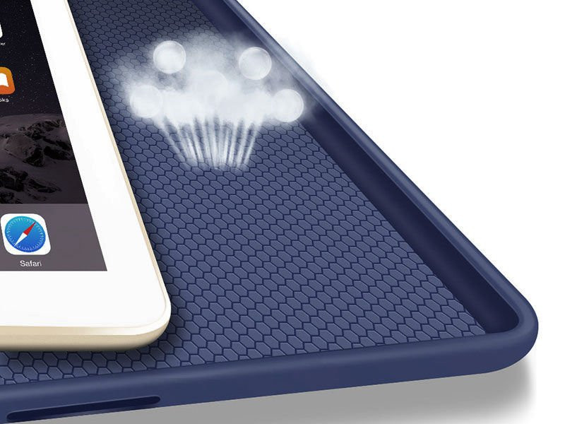 Całość została wykonana w starym stylu tzw. książki, w którym zarówno przednia nakładka jak i tylna stanowią jedność. Tylny panel jest wykonany z elastycznego TPU, dzięki czemu idealnie przylega do iPada. Dodatkowo panel ten został wyposażony w technologię poduszek powietrznych, co gwarantuje jeszcze większe bezpieczeństwo naszego urządzenia podczas niespodziewanych upadków, a specjalna struktura "sieci pajęczej" zabezpieczy urządzenie przed przegrzaniem. Etui posiada funkcję wybudzania urządzenia - Sleep / Wake, co wpływa znacząco na dłuższą żywotność baterii.