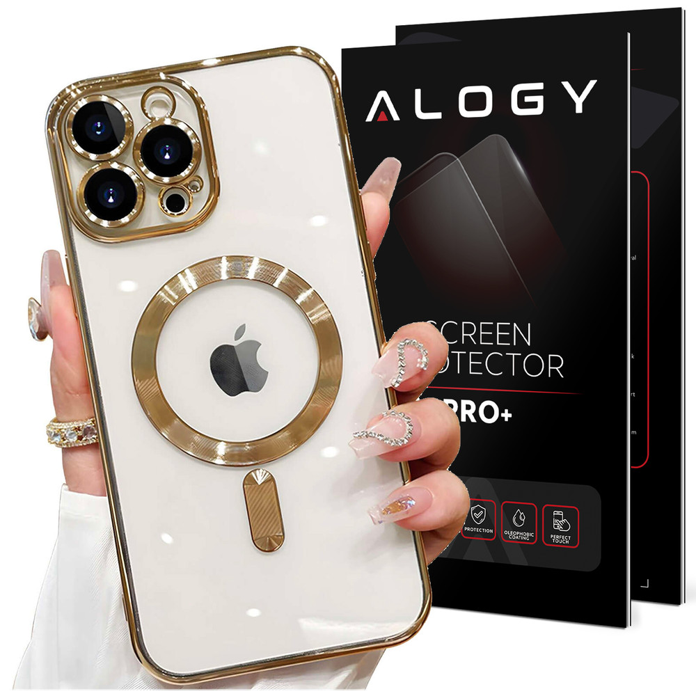 Etui MagSafe Case do iPhone 15 Pro Glamour Luxury obudowa Slim Ring Alogy Złote przezroczyste + Szkło