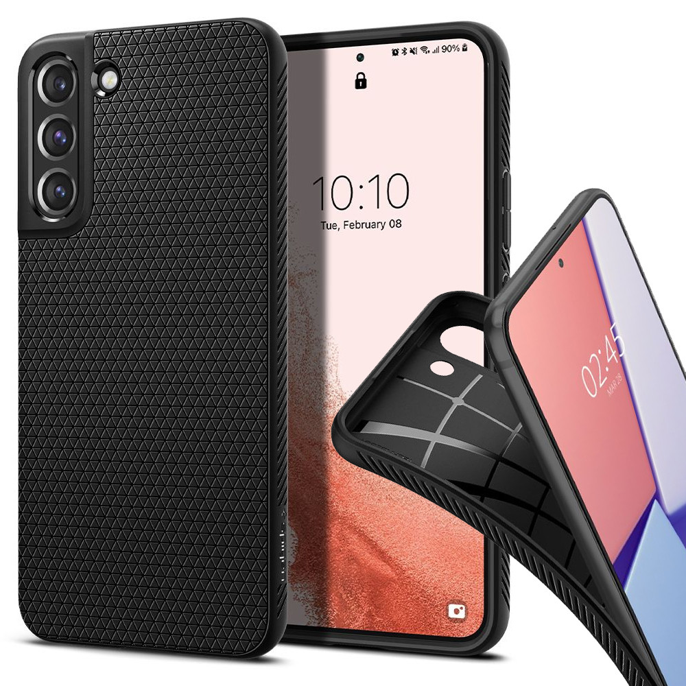 Etui na telefon Spigen z serii Liquid Air to produkt zaprojektowany specjalnie do Samsung Galaxy S22. Został wykonany z wysokiej jakości elastycznego poliuretanu (TPU), który dzięki swoim właściwościom dopasowuje się do urządzenia, minimalizując możliwość jego wyślizgnięcia oraz nie zwiększając znacząco jego rozmiarów. Etui Liquid Air zabezpiecza telefon przed uszkodzeniami w skutek upadku ze średniej wysokości, absorbując siłę uderzenia.