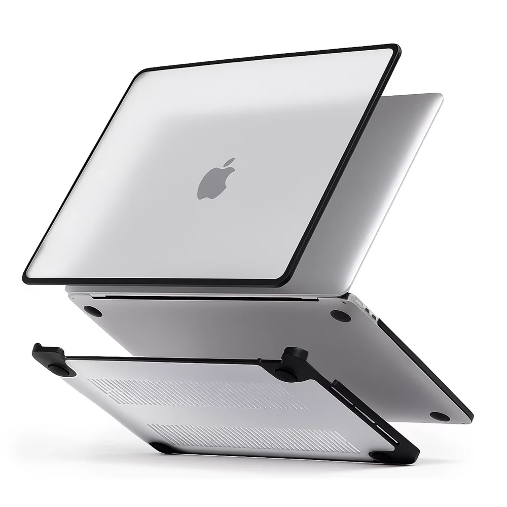 Dwuczęściowa konstrukcja chroni górę i spód MacBooka, a elastyczna czarna ramka TPU amortyzuje każdy wstrząs. Matowa, półprzezroczysta pokrywa subtelnie przepuszcza logo Apple, zachowując elegancję urządzenia. Antypoślizgowe nóżki i żeberkowa wentylacja dbają o stabilność i chłodzenie. To etui, które nie tylko świetnie wygląda – ono naprawdę zabezpiecza Twój MacBook przed codziennym zużyciem.