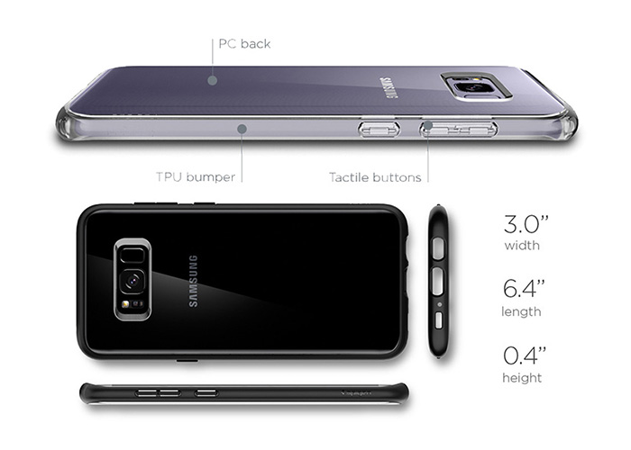 Etui Spigen Ultra Hybrid Samsung S8+ Plus to jednoczęściowy futerał, łączący w sobie elastyczną poliuretanową ramkę oraz twardy poliwęglanowy tył. Zadaniem etui jest przede wszystkim zapewnienie ochrony, w czym sprawdza się świetnie. Zaimplementowana technologia "Air Cushion", składająca się na poduszki powietrzne w rogach etui świetnie rozprowadza siłę uderzenia podczas upadku, co minimalizuje wszelkie uszkodzenia, które mogą wyniknąć z tego typu incydentu. Samo etui posiada również certyfikat, potwierdzający militarny poziom ochrony. Pokrowiec pomimo konstrukcji osłaniającej głównie tylną część urządzenia, posiada także rant wystający ponad ekran, mający na celu zapewnienie ochrony przed porysowaniem ekranu. Taki sam rant wyprofilowany jest również wokół wycięcia na aparat, mający na celu dokładnie takie samo zabezpieczenie.