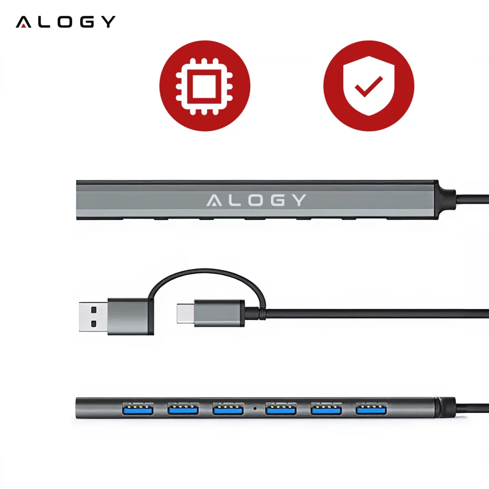 ✅ Hub Alogy 7w1 oferuje 1 port USB-A 3.0 o prędkości transferu 5 Gb/s oraz 6 portów USB-A 2.0 do standardowych urządzeń peryferyjnych.