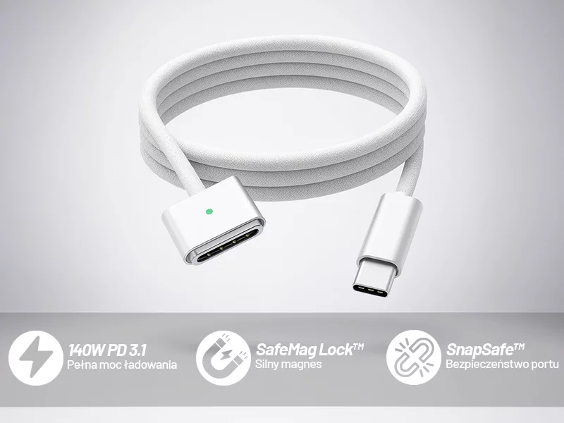 ✅ SnapSafe™ – automatyczne rozłączenie przy naprężeniu – gdy kabel zostanie szarpnięty, magnes natychmiast odskakuje, chroniąc komputer przed upadkiem i port przed uszkodzeniem. To proste, ale niezwykle skuteczne zabezpieczenie, które realnie oszczędza Twoje pieniądze.