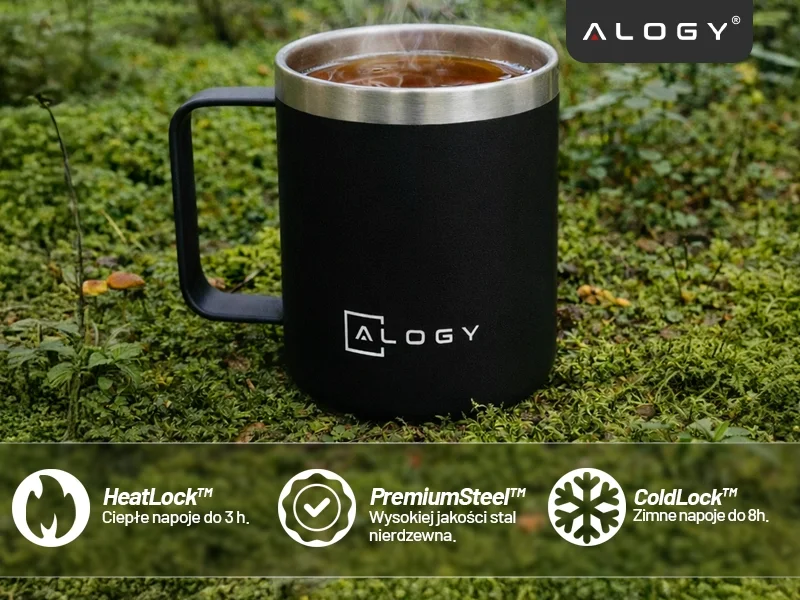 Kubek termiczny 420ml z uchwytem pokrywką na kawę herbatę stalowy zimne i ciepłe napoje Alogy Czarny
