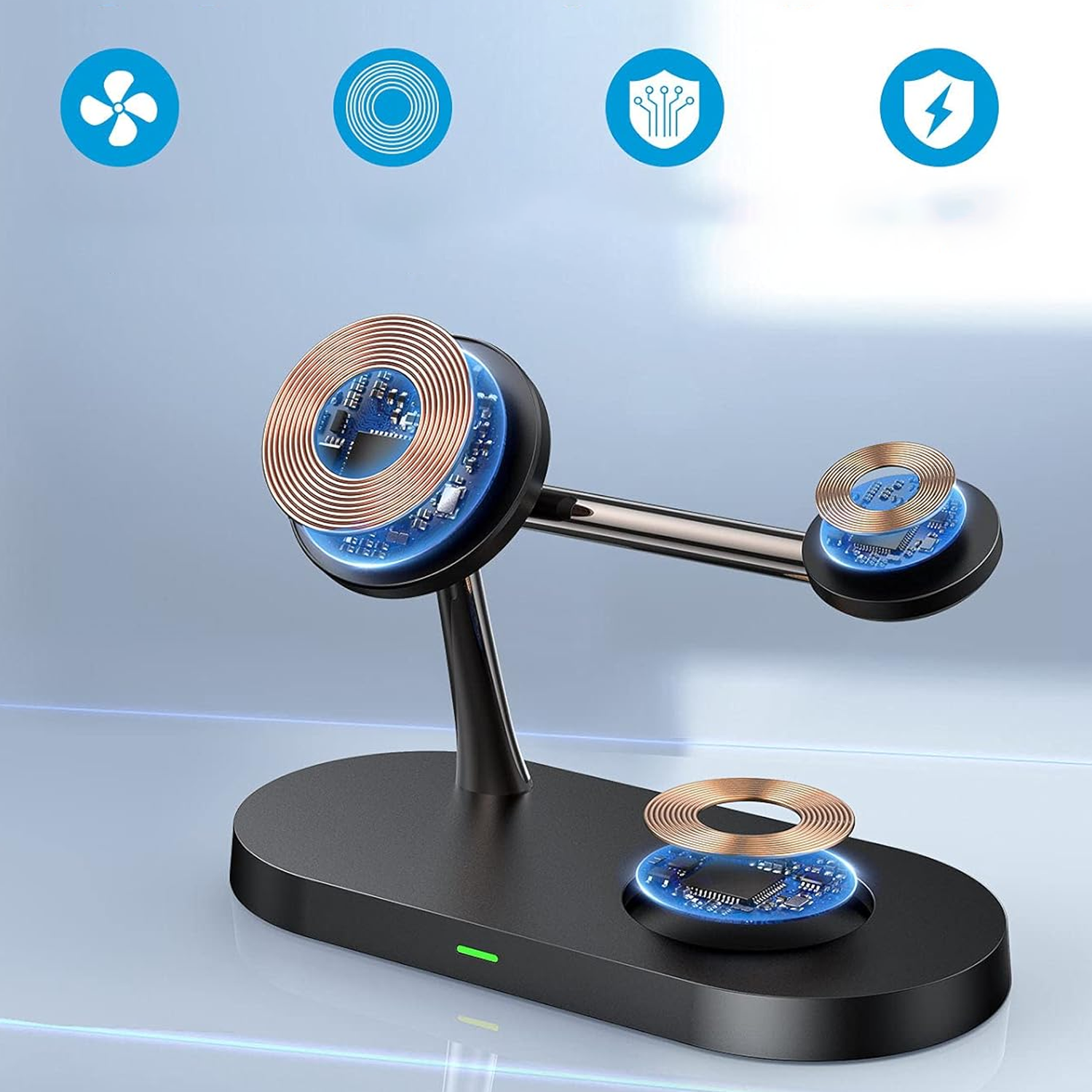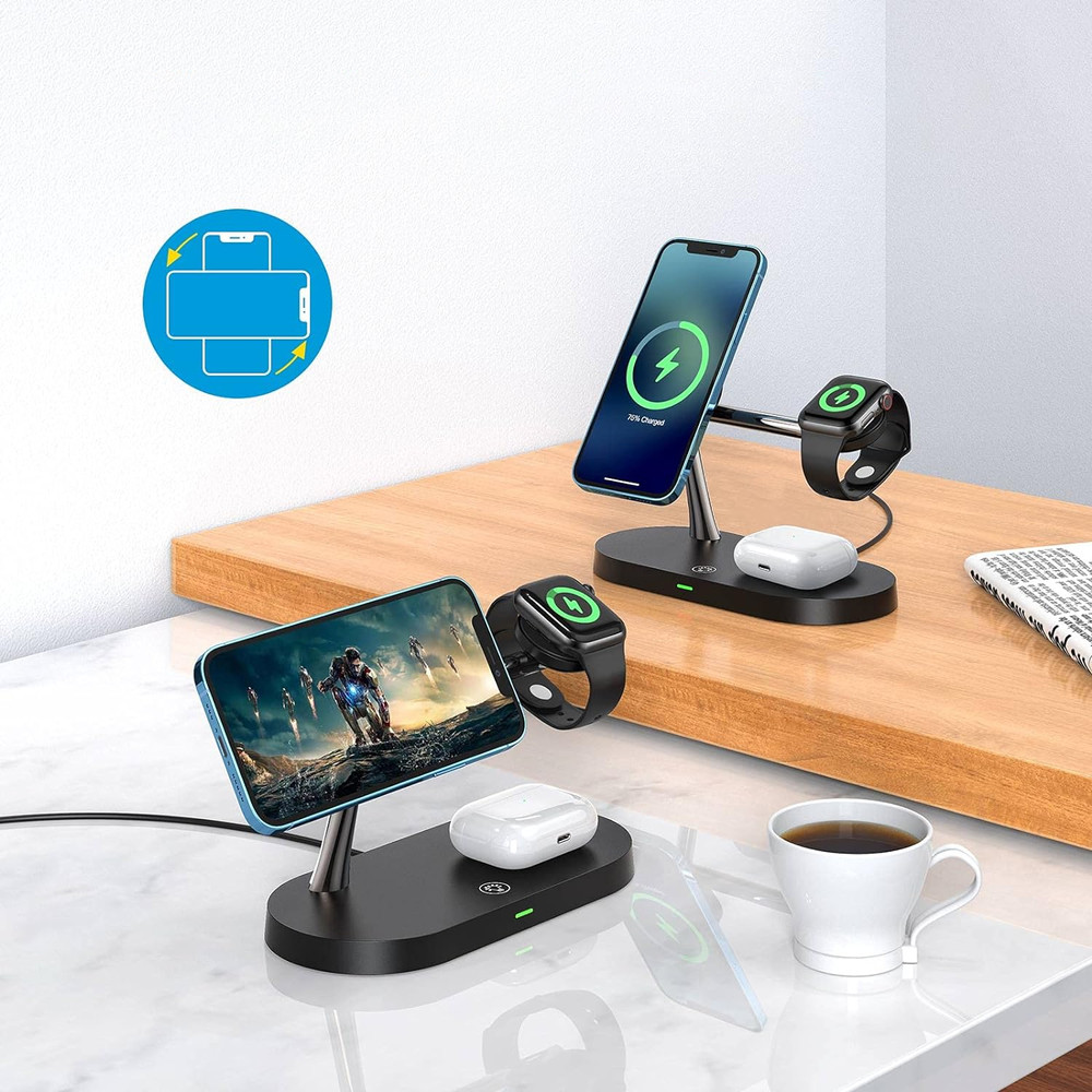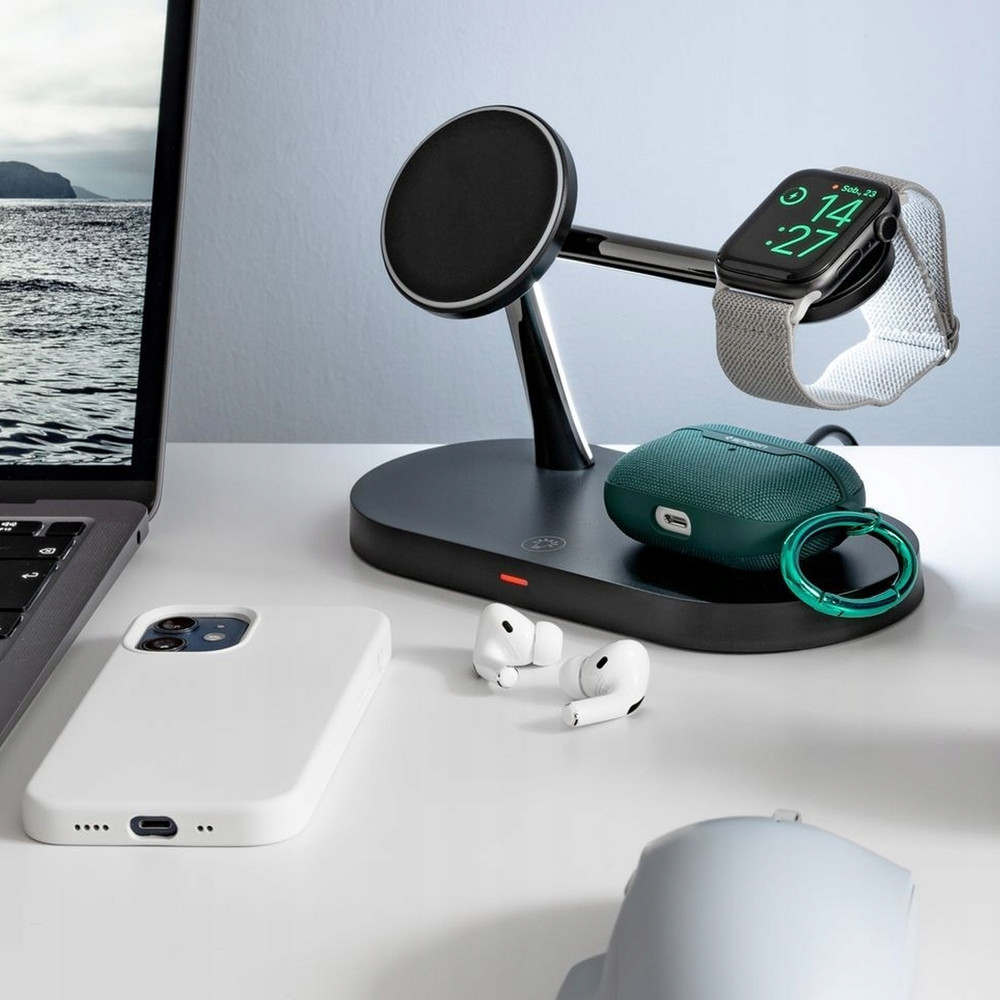 Ładowarka obsługuje jednoczesne ładowanie trzech urządzeń jednocześnie takich jak: iPhone, Apple Watch oraz Airpods lub drugi iPhone, co sprawia, że jest idealna do użytku domowego, biurowego lub podczas podróży.