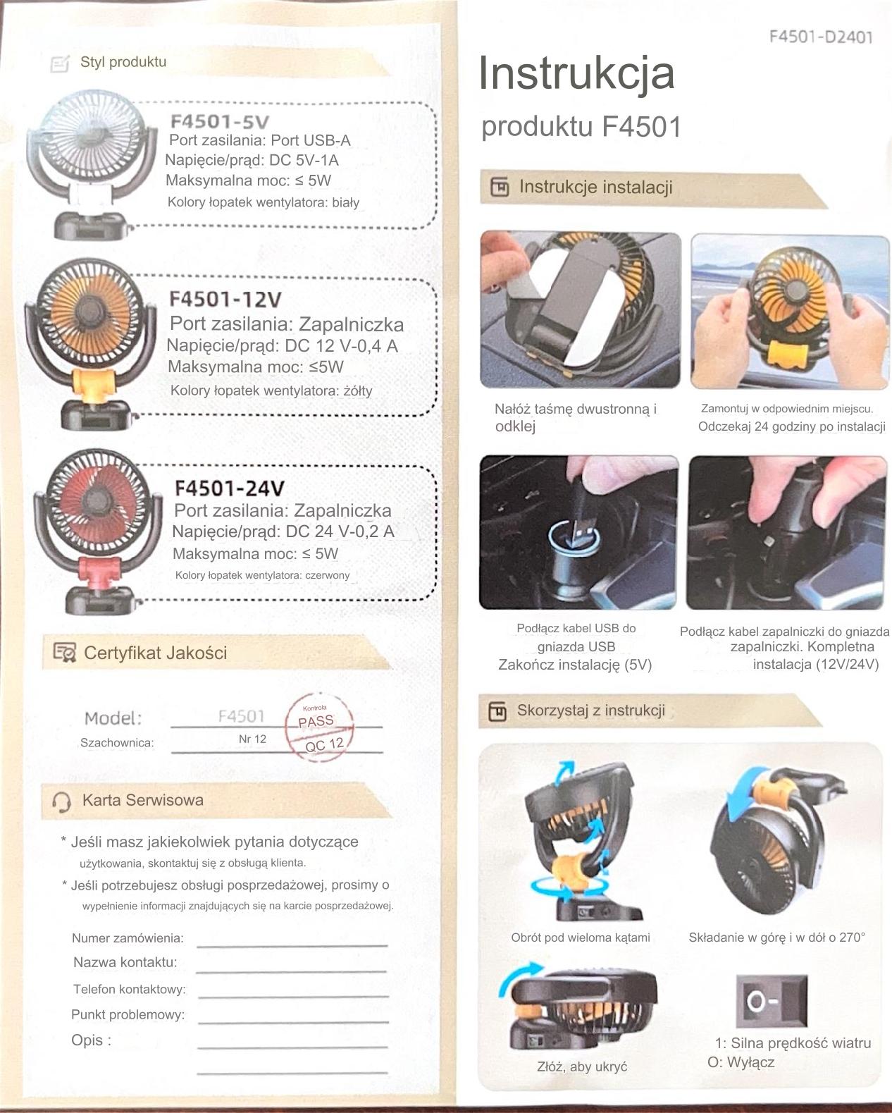 - ✅ Zasilanie 12 V – energooszczędny wiatrak podłączysz do gniazda zapalniczki, a pobór mocy ~5 W nie obciąży akumulatora.