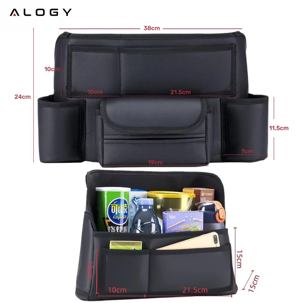 Alogy CarOrganizer Pro™ – Skórzany organizer samochodowy PU między fotelami, 5 kieszeni, uchwyty na napoje