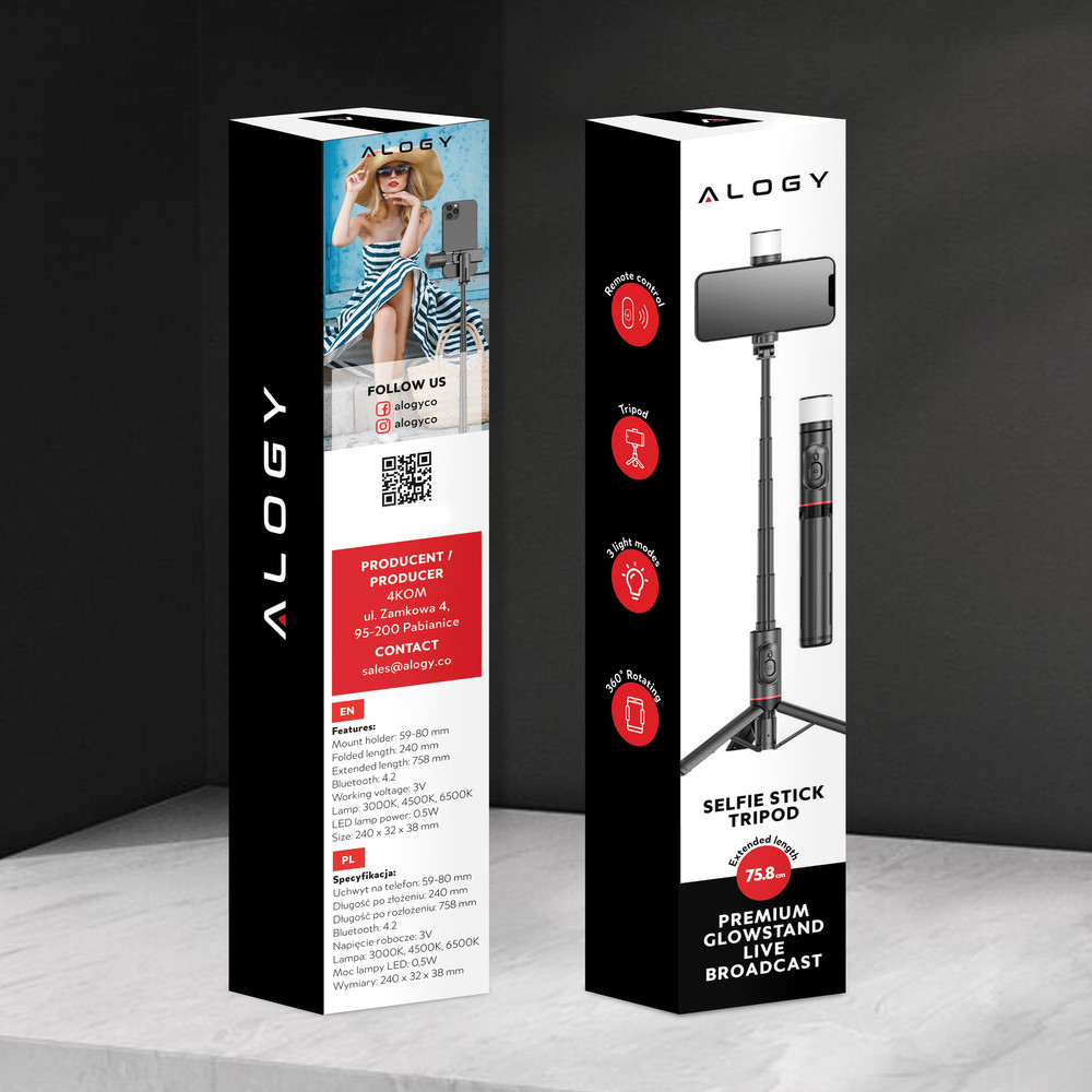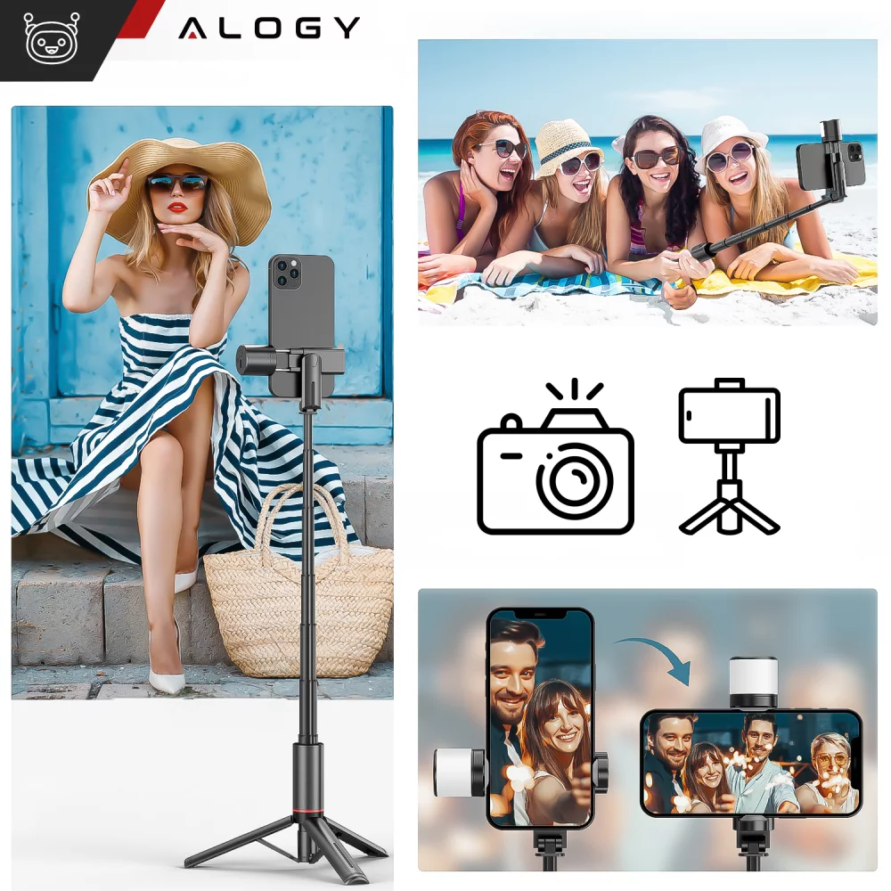 - Zawartość: 1x Selfie stick, 1x Pilot Bluetooth, Oryginalne pudełko Alogy