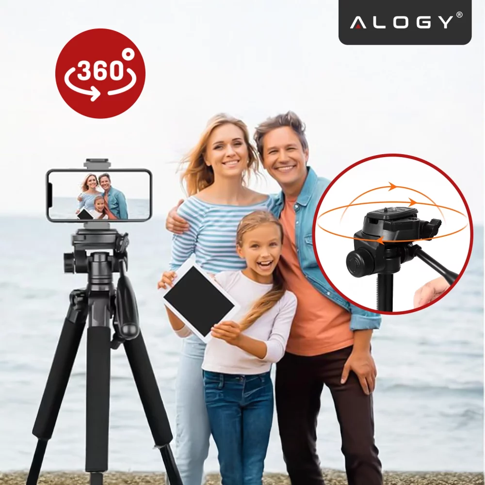 Uniwersalny uchwyt na telefon w zestawie – pasuje do większości smartfonów, a gwint 1/4" umożliwia montaż aparatów i kamer, dzięki czemu statyw Alogy jest gotowy do użycia od razu, bez potrzeby dokupowania dodatkowych akcesoriów.