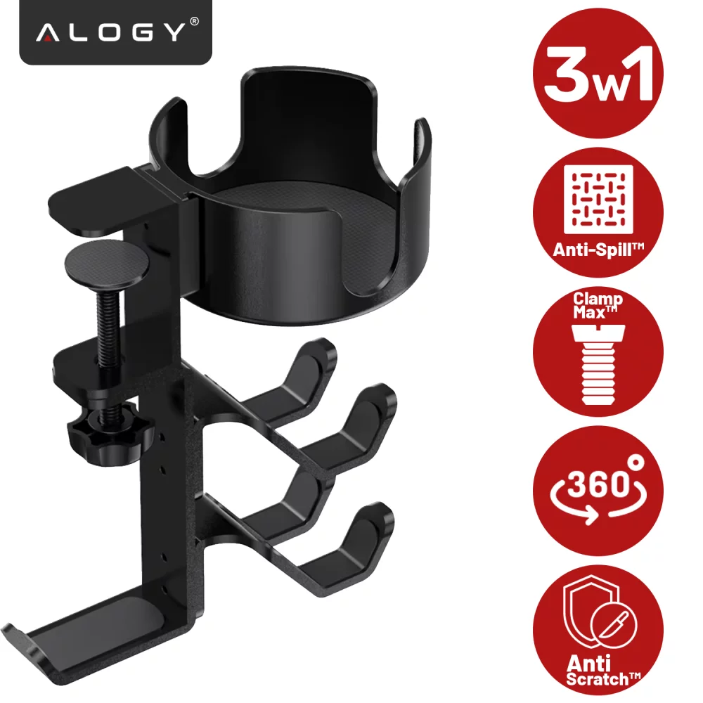 Uchwyt do biurka wielofunkcyjny – na kubek, pady i słuchawki, mocowanie do blatu, antypoślizgowy i stabilny – Alogy DeskClamp™ Czarny